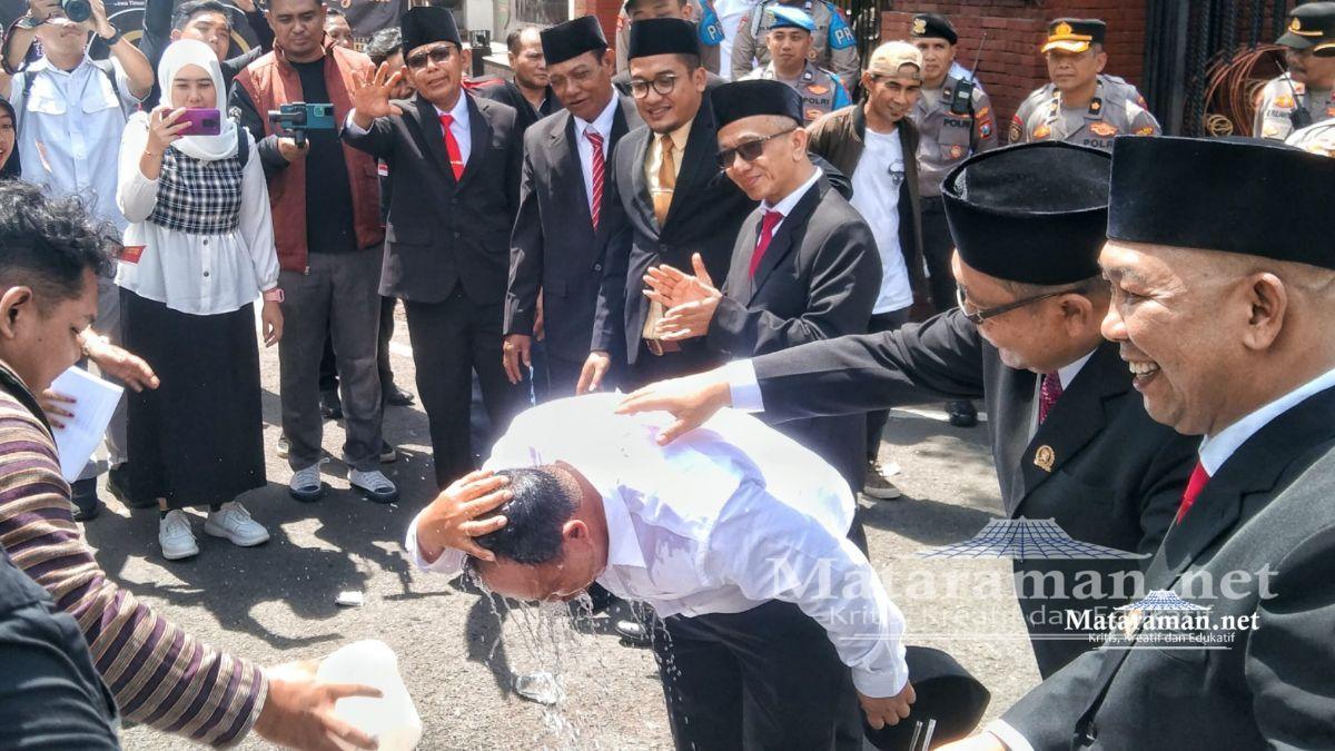 Doding Rahmadi mengiyakan permintaan massa, dengan mencopot kopiah, politikus PDIP ini menerima guyuran air dari pendemo. Alhasil basah kuyup menjadi pemandangan setelahnya. (mad)