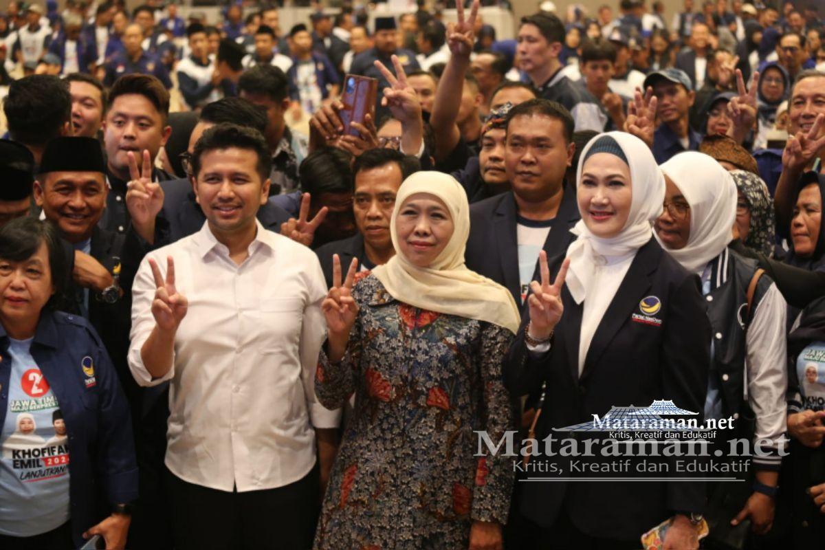 “Izinkan saya katakan bahwa saya mengatakan tenang saja. Karena koalisi yang mengusulkan Khofifah-Emil terus terang juga yang luar biasa. Saya ingin kader-kader kita mengetuk pintu masyarakat dan buktinya sudah terlihat di depan hari ini,” akuinya.