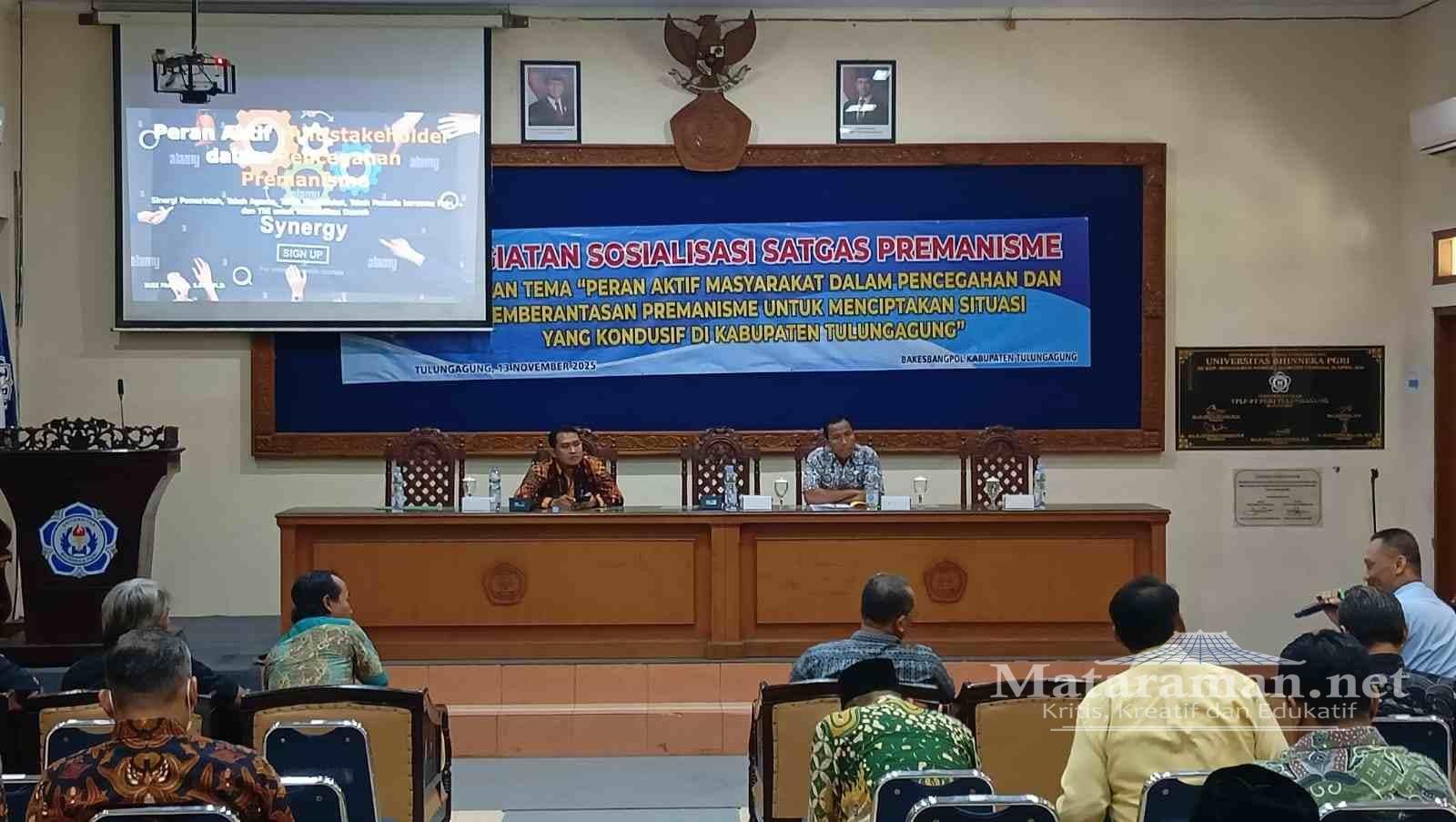 Tulungagung, Mataraman.net –  Badan Kesatuan Bangsa dan Politik (Bakesbangpol) Kabupaten Tulungagung sukses menghelat Sosialisasi Satgas Premanisme di Auditorium Bhineka Universitas Bhineka (UBHi) Tulungagung), Kamis (13/11/2025). Kegiatan dengan tema ‘Peran Aktif Masyarakat dalam Pencegahan dan Pemberatan Premanisme untuk Menciptakan Situasi yang Kondusif di Kabupaten Tulungagung’.