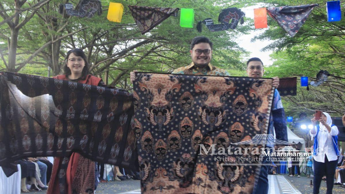 Tampak Mas Dhito ditemani Mbak Cicha, Wabub Kediri Dewi Maria Ulfa, Kepala Dinas Kebudayaan dan Pariwisata serta perancang desain melaunching redesain Batik Panji. Mas Dhito membentangkan kain Batik Panji dihadapan penonton festival. (mad)