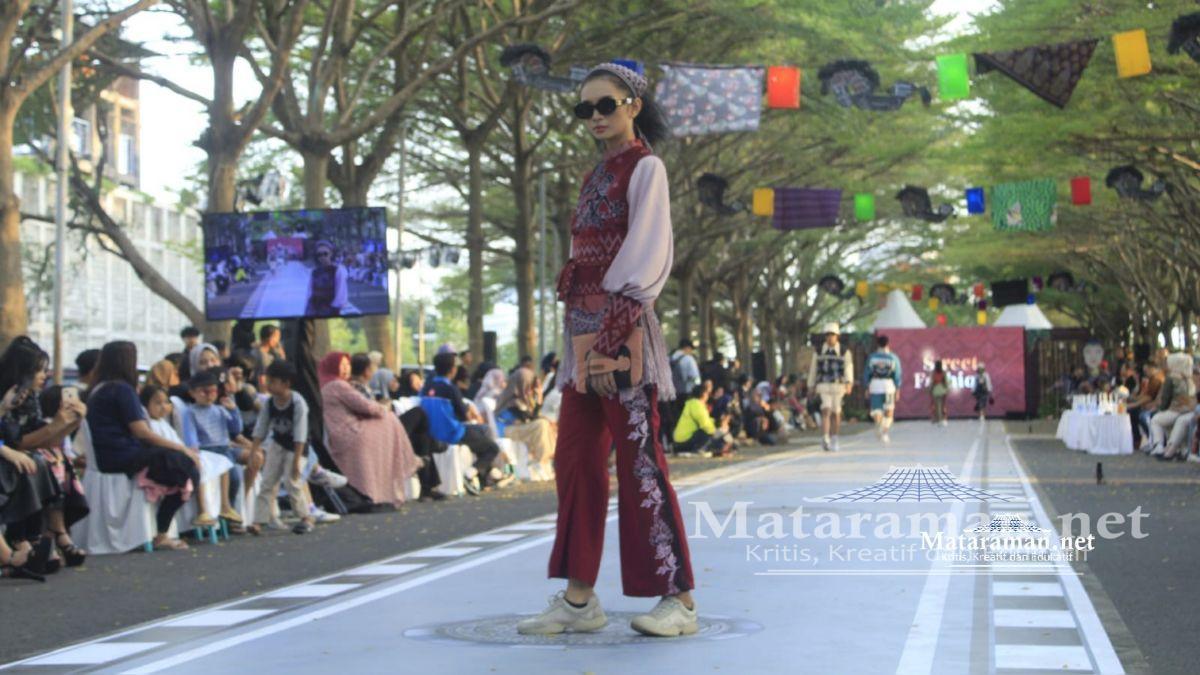 Jalan besar di area SLG Kediri disulap menjadi area fashion show. Puluhan talent berlenggak lenggok diatas jalan raya. Pakaian batik hasil rancangan desainer memukai penonton yang menyaksikan.