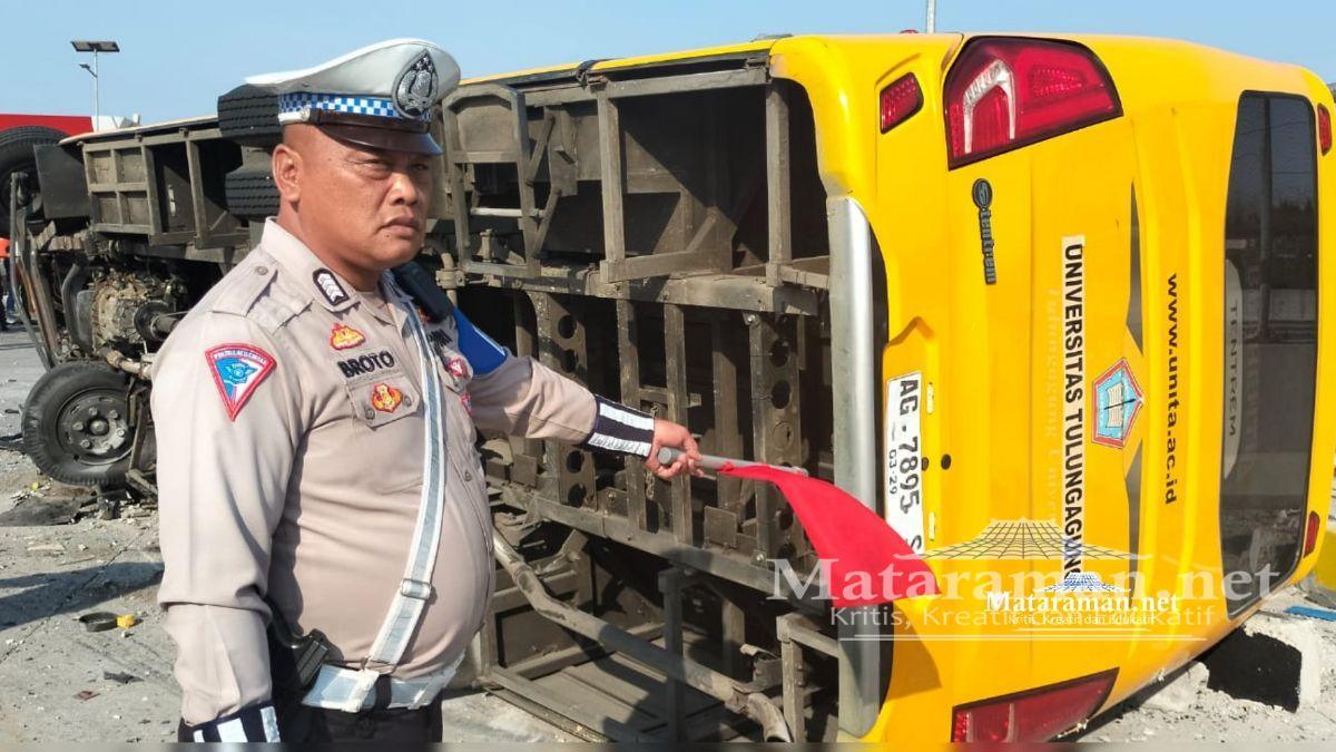 Terpisah, Kasat PJR Ditlantas Polda Jatim Ajun Komisaris Besar Polisi Imet Chaerudin dari data yang diterima Mataraman.net, bus menghantam beton pembatas hingga terguling. Pihaknya menjelaskan untuk dugaan sementara bus yang dikendarai Maman (51) asal Dusun Mekarsari 02/01 Tulungagung karena rem blong.