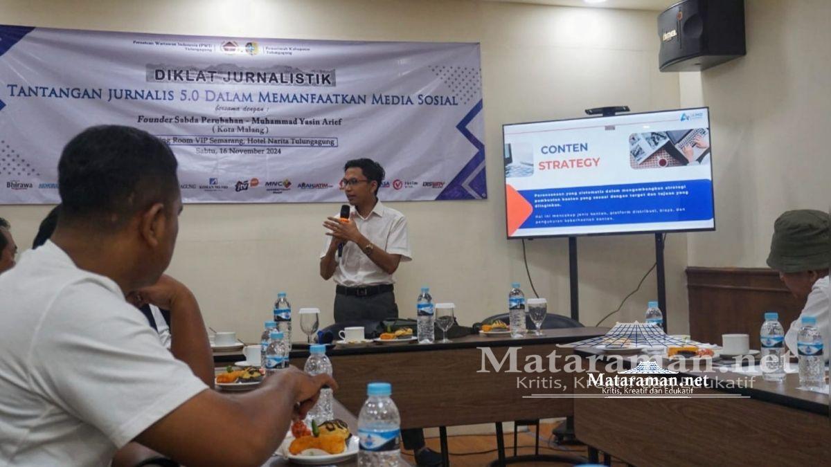 Ada beberapa hal yang disampaikan Muhammad Yasin Arief saat menjadi narasumber di acara pelatihan jurnalistik PWI Tulungagung. Mulai dari strategi pembuatan konten, hingga alogaritma masing-masing platform medsos.